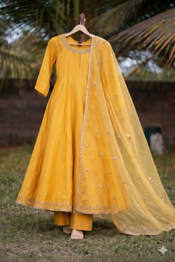 A graceful mustard yellow kurti set featuring delicate embroidery and a sheer embellished dupatta, perfect for festive occasions and elegant daywear.